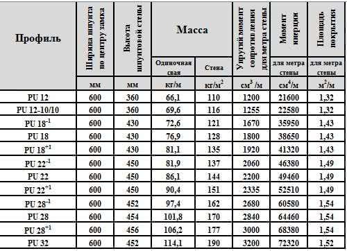 Технические характеристики шпунта PU