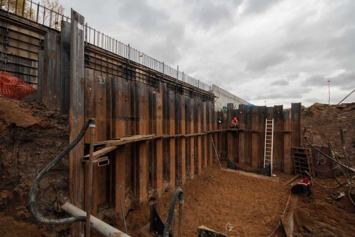 В зависимости от глубины траншеи и типа грунта шпунтовая стенка может быть независимой (автономной) или усиленной. Для траншеи самый подходящий тип усиления шпунта – система распоров, поскольку у траншеи, в отличие от котлована, нет торцевых стенок, которые замыкают контур укрепления.